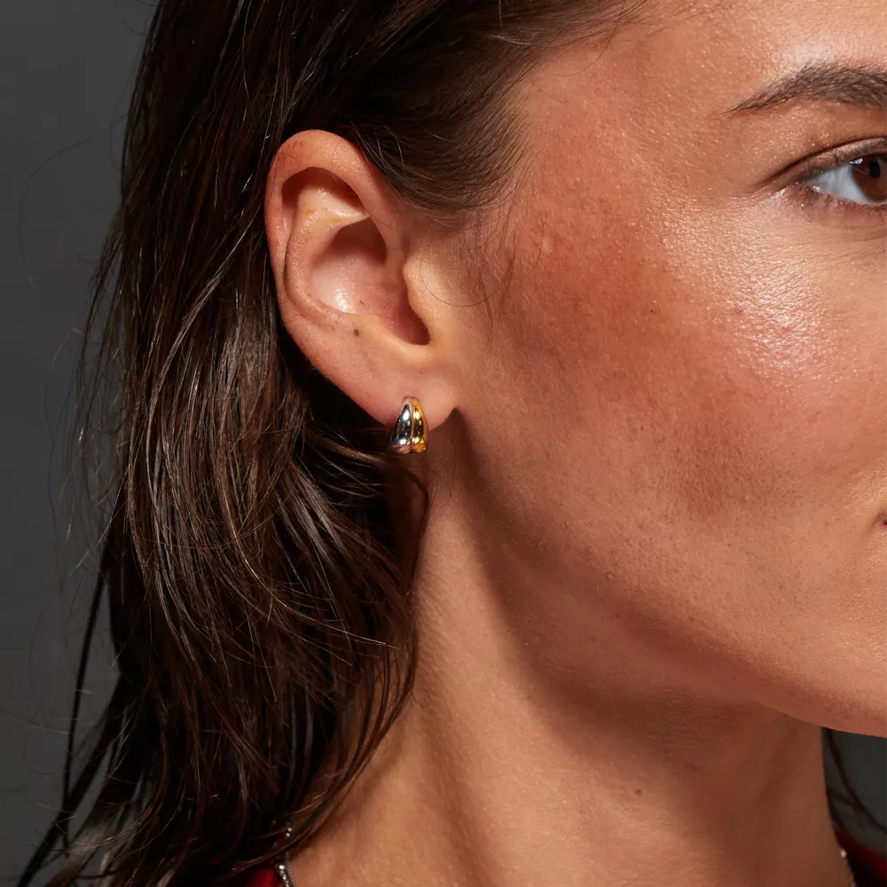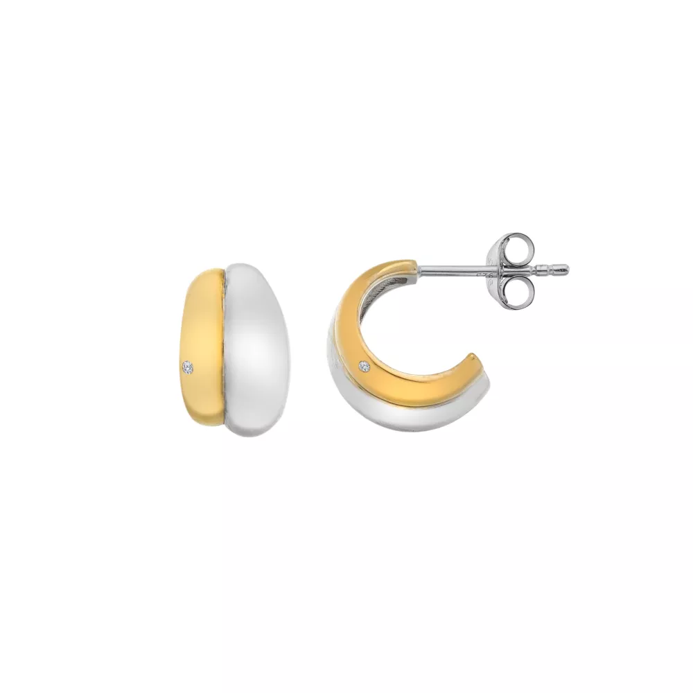 Stříbrné náušnice Droplet Two Tone s diamantemNáušnice Droplet Two Tone představují moderní pojetí klasického designu. Masivnější tvar působí elegantně a sebevědomě, zatímco kombinace rhodiovaného stříbra a 18kt zlacení dodává šperku jedinečný kontrast a nadčasovost.Díky své univerzálnosti se skvěle hodí jak k dalším zlatým, tak i stříbrným doplňkům, a vytváří tak dokonalý vrstvený look.Každý pár je pečlivě osazen pravým diamantem.Šířka náušnic je 8 mm – ideální velikost pro každodenní nošení i speciální příležitosti.