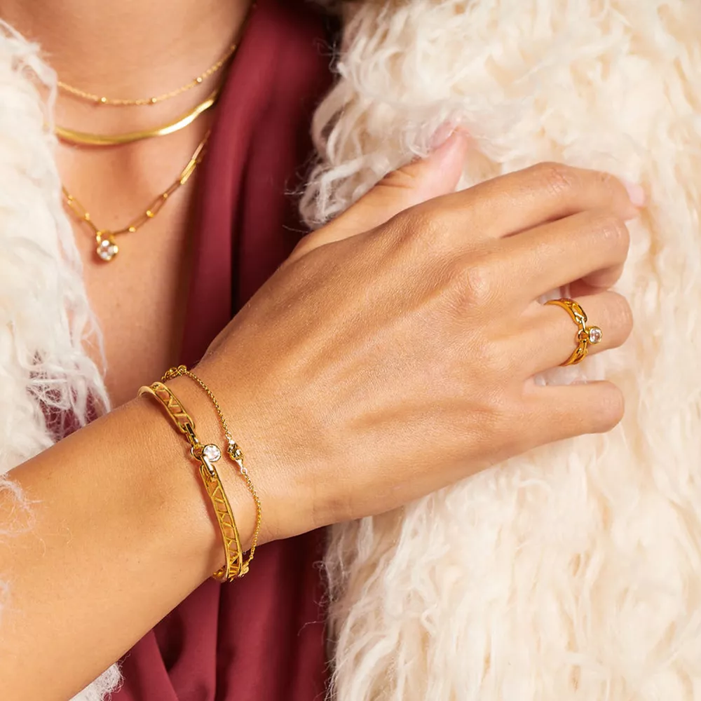 Prsten Revolve je novou ikonou mezi šperky.Zaujme jedinečným designem se zlatým zářivým povrchem a motivem jemného zámečku zdobeného drobným krystalem White Topaz. Tento detail mu dodává moderní i elegantní charakter, díky čemuž se stává šperkem, který nesmí chybět ve vaší šperkovnici.Prsten je vyroben z rhodiovaného stříbra pokoveného 18kt zlatem a je ručně osazen pravým diamantem. Jeho šířka je 5 mm, což z něj dělá decentní, ale přesto výrazný doplněk. Každý prsten obdržíte v originální dárkové krabičce Hot Diamonds.