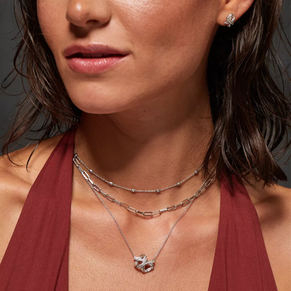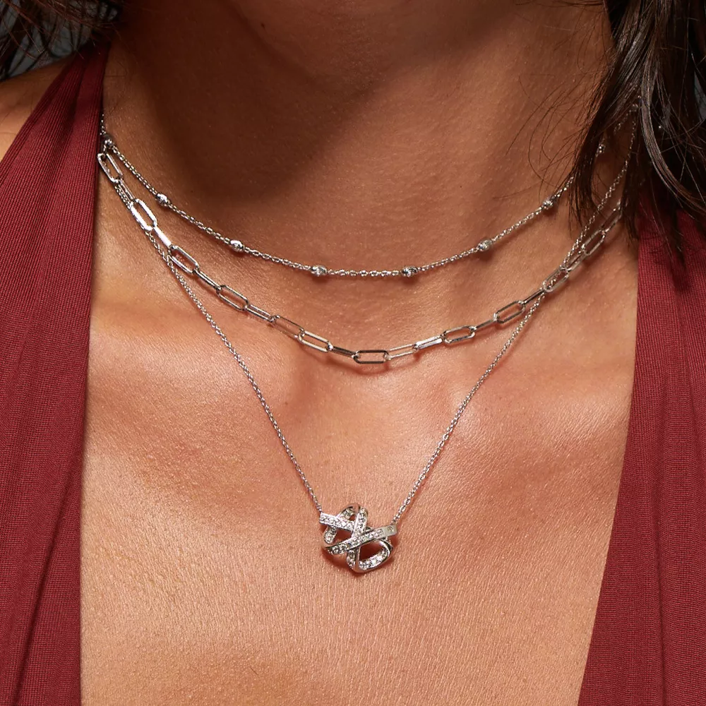 Stříbrný náhrdelník Aurora s diamantem a topazemNáhrdelník Aurora okouzlí elegantními zatočenými tvary přívěsku, které jsou osazeny třpytivými bílými topazy. Tento nadčasový design dodává šperku sofistikovaný vzhled a dokonale zvýrazní každý outfit.Přívěsek je vyroben z rhodiovaného stříbra a ručně osazen pravým diamantem o velikosti 0,01 ct (I3/H). Jeho rozměr je 20 x 16 mm a je zavěšen na řetízku o délce 40–45 cm, který pohodlně padne kolem krku.Šperk je dodáván v originální krabičce Hot Diamonds a součástí balení je certifikát potvrzující pravost a kvalitu diamantu.