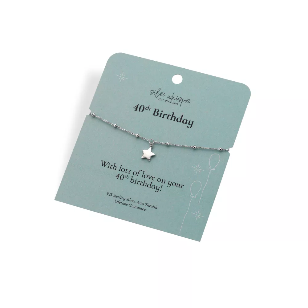 Oslavte čtyřicetiny s náramkem „40th Birthday“. Hvězdný přívěsek, 925 sterlingové stříbro, rhodiová úprava. Dodáváno v luxusním balení – perfektní dárek k významnému jubileu.Překlad na kartičce:S velkou láskou k tvým 40. narozeninám!
