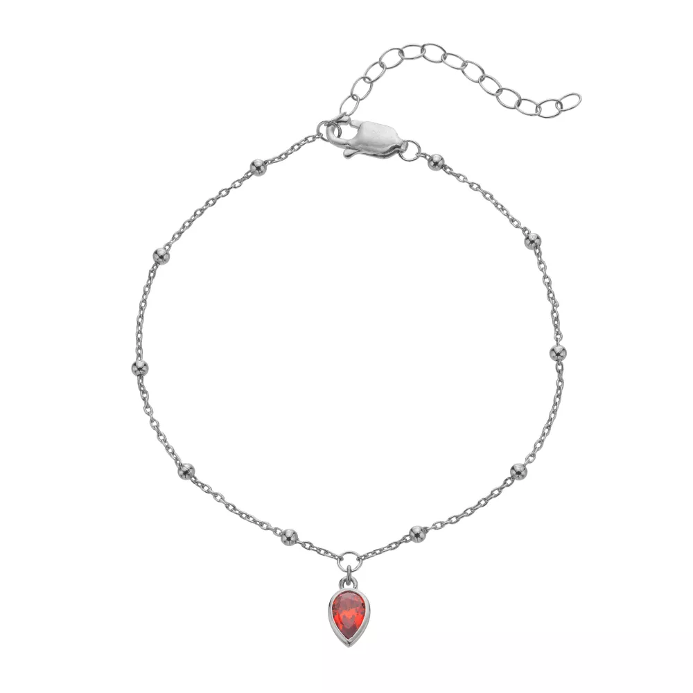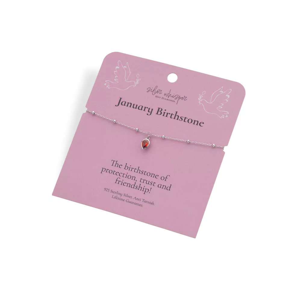 Náramek „January“ s přívěskem osazeným kubickou zirkonií v barvě červeného granátu, inspirovaným měsícem leden a symbolizujícím ochranu, důvěru a přátelství.Dodává sílu a odvahu překonávat překážky.Vyroben z 925 rhodiovaného stříbra, odolného proti zčernání.Dodáván na barevné kartičce s luxusním dárkovým sáčkem – ideální narozeninový dárek pro někoho narozeného v lednu.