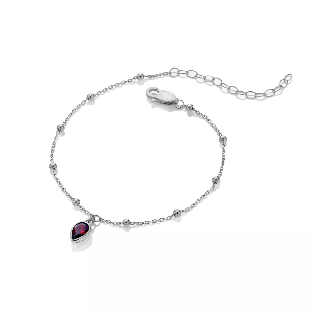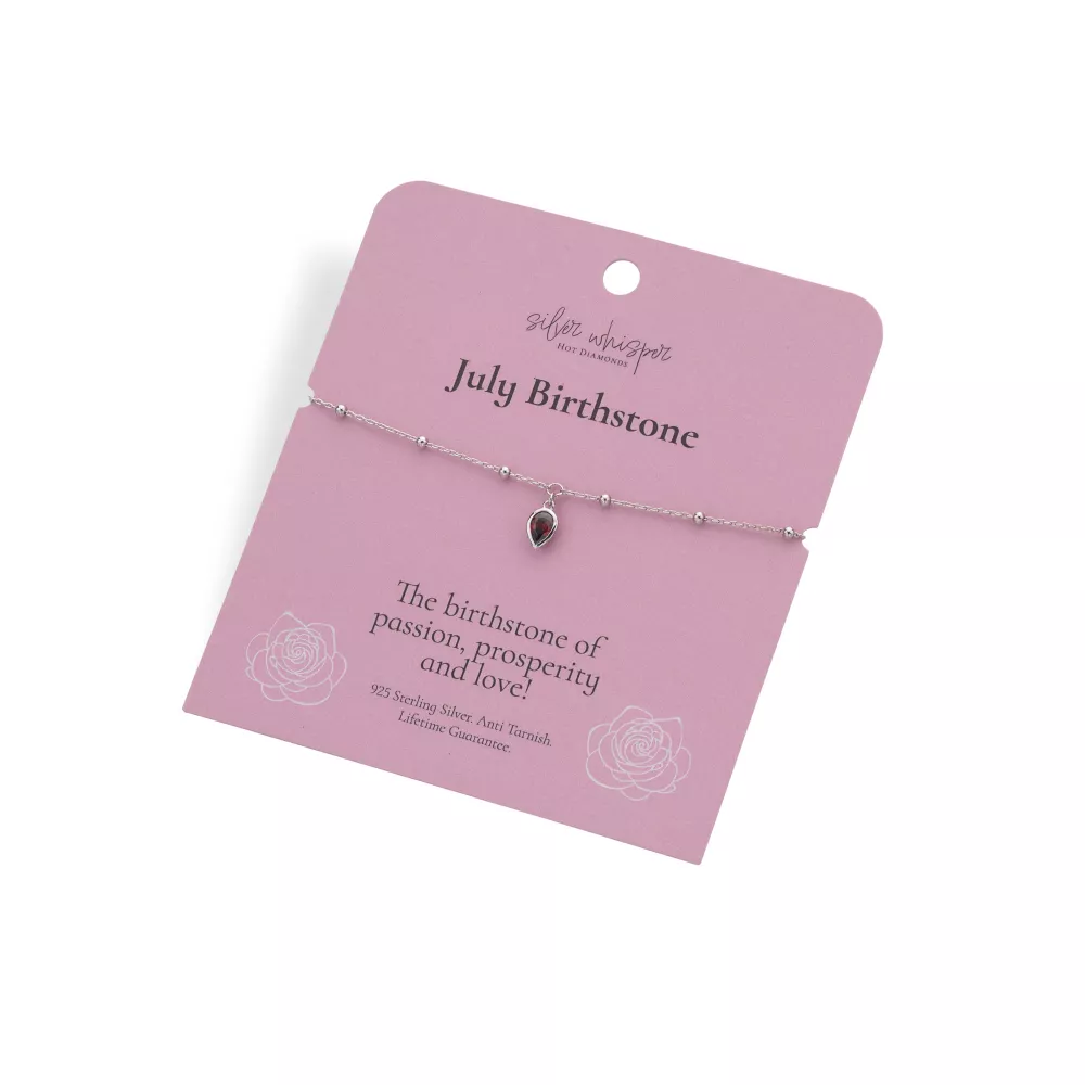 Náramek „July“ s přívěskem osazeným kubickou zirkonií v barvě červeného karneolu, inspirovaným měsícem červenec a symbolizujícím vitalitu a energii.Dodává odvahu a životní sílu.Vyroben z 925 rhodiovaného stříbra, odolného proti zčernání.Dodáván na barevné kartičce s luxusním dárkovým sáčkem – ideální narozeninový dárek pro někoho narozeného v červenci.