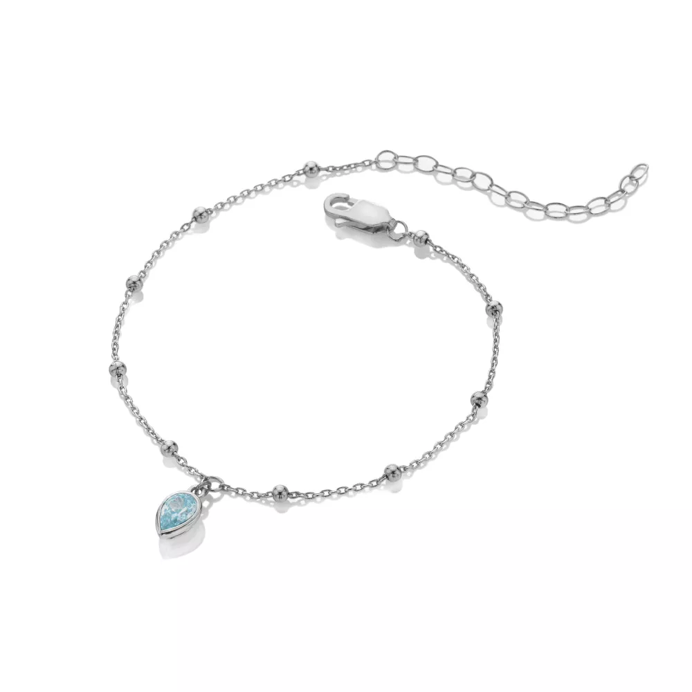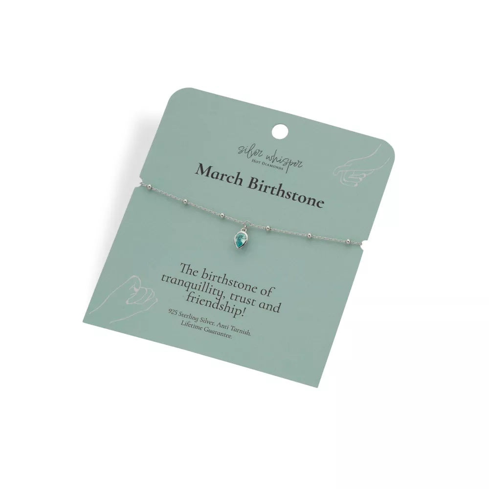 Náramek „March“ s přívěskem osazeným kubickou zirkonií ve světlé akvamarínové barvě, inspirovaným měsícem březen a symbolizujícím klid, důvěru a přátelství. Napomáhá otevřené komunikaci a vnitřnímu míru. Vyroben z 925 rhodiovaného stříbra, odolného proti zčernání. Dodáván na barevné kartičce s luxusním dárkovým sáčkem – ideální narozeninový dárek pro někoho narozeného v březnu. Překlad na kartičce: Narozeninový kámen klidu, důvěry a přátelství.