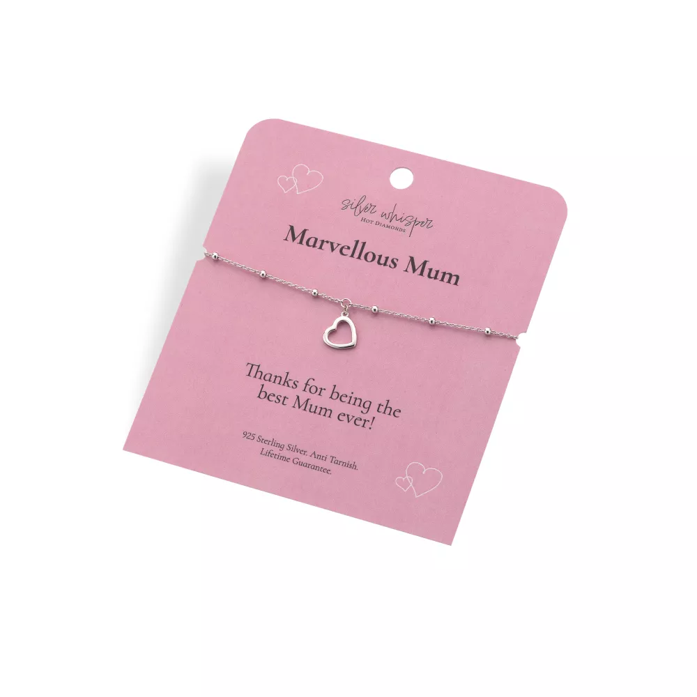 Náramek „Marvellous Mum“ je krásným vyjádřením lásky k mamince. Přívěsek ve tvaru srdce, 925 sterlingové stříbro, rhodiová úprava. Dodáváno v elegantním balení – perfektní dárek ke Dni matek nebo narozeninám.Překlad na kartičce:Děkuji ti, že jsi ta nejlepší maminka na světě!
