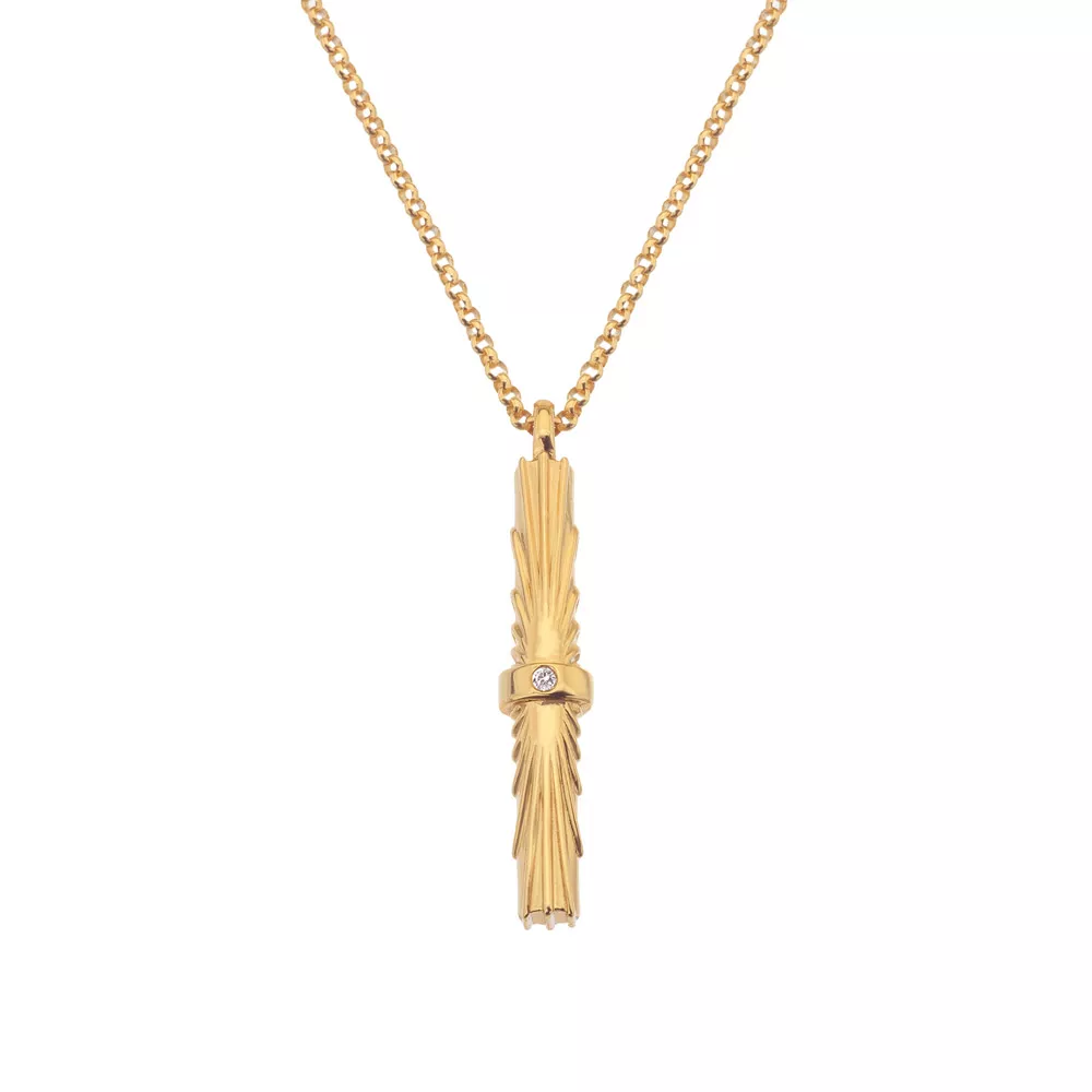 “Každý náhrdelník je mimořádný, ať už si vyberete ten stříbrný či mosazný, oba budou pozlaceny 18-ti karátovým zlatem a osazeny pravým diamantem.”