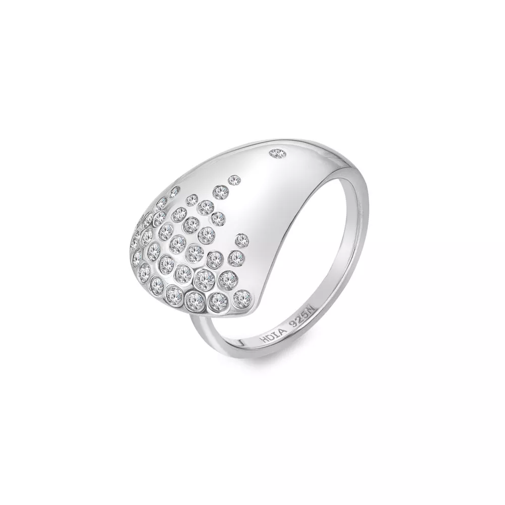 Elegantní zakřivení prstenu Spritz je poseto bílými topazy, každý kámen je ručně zasazený a doplněný pravým diamantem.Prsten je vyroben z rhodiovaného stříbra nejvyšší kvality a jeho nejširší bod měří 16 mm.